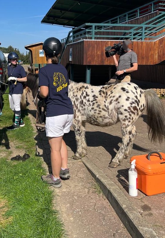 Und warum war das Shetty-Festival 2023 nun das außergewöhnlichste war? Ganz einfach, man könnte behaupten Pia und Vanessa sind jetzt sowas wie berühmt! 😉 Am Samstag war ein Fernsehteam von „Sat.1 Regional“ auf der Rennbahn, um einen Bericht über das Festival zu drehen und wir haben uns bereit erklärt gefilmt und interviewt zu werden! Ungefähr zwei Stunden begleitete uns das Team bei unseren Aktionen und Vorbereitungen und filmte uns, als wir die Prüfungen absolvierten und stellte uns Fragen über unsere Shettys und das Festival. So etwas passiert uns wahrscheinlich auch nur einmal im Leben.