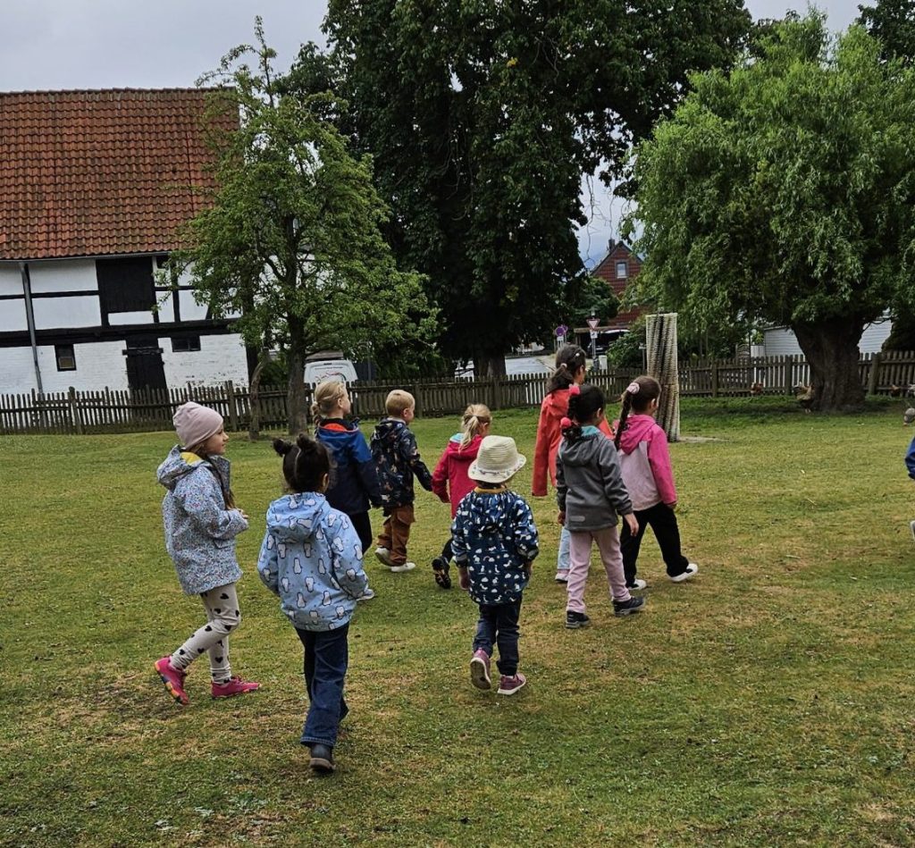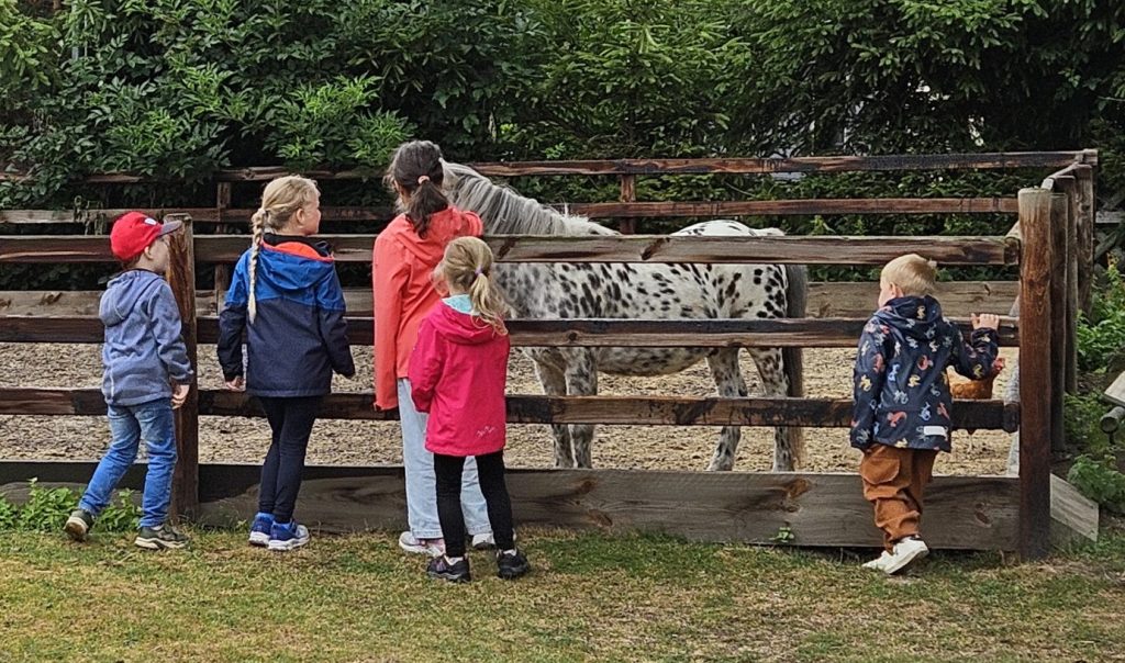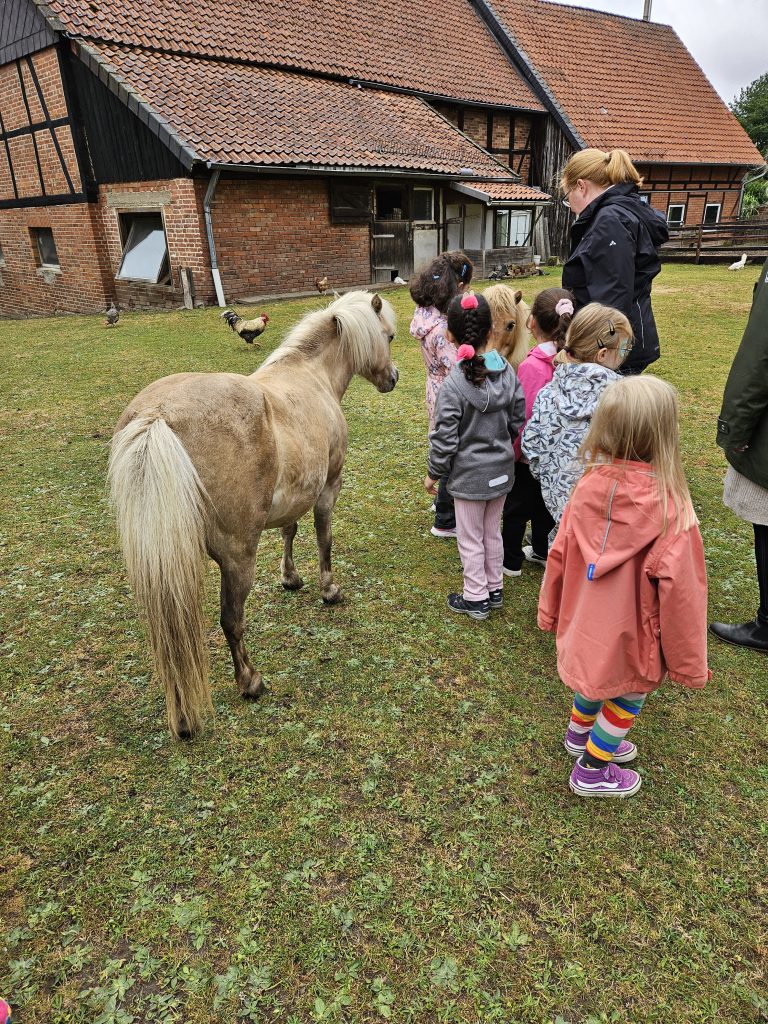 Am 09.07.2025 haben uns 16 Kinder und 3 Betreuerinnen der „gelben Gruppe, des Kindergartens Kunterbunt“ aus Goslar besucht. Die Kids hatten grade das Thema „Pferde“ und wollten sich diese nun einmal in natura ansehen, natürlich am liebsten auf Augenhöhe. Deshalb fragten sie uns, ob ein Besuch bei den Harzshettys möglich wäre, was wir gerne möglich machten.