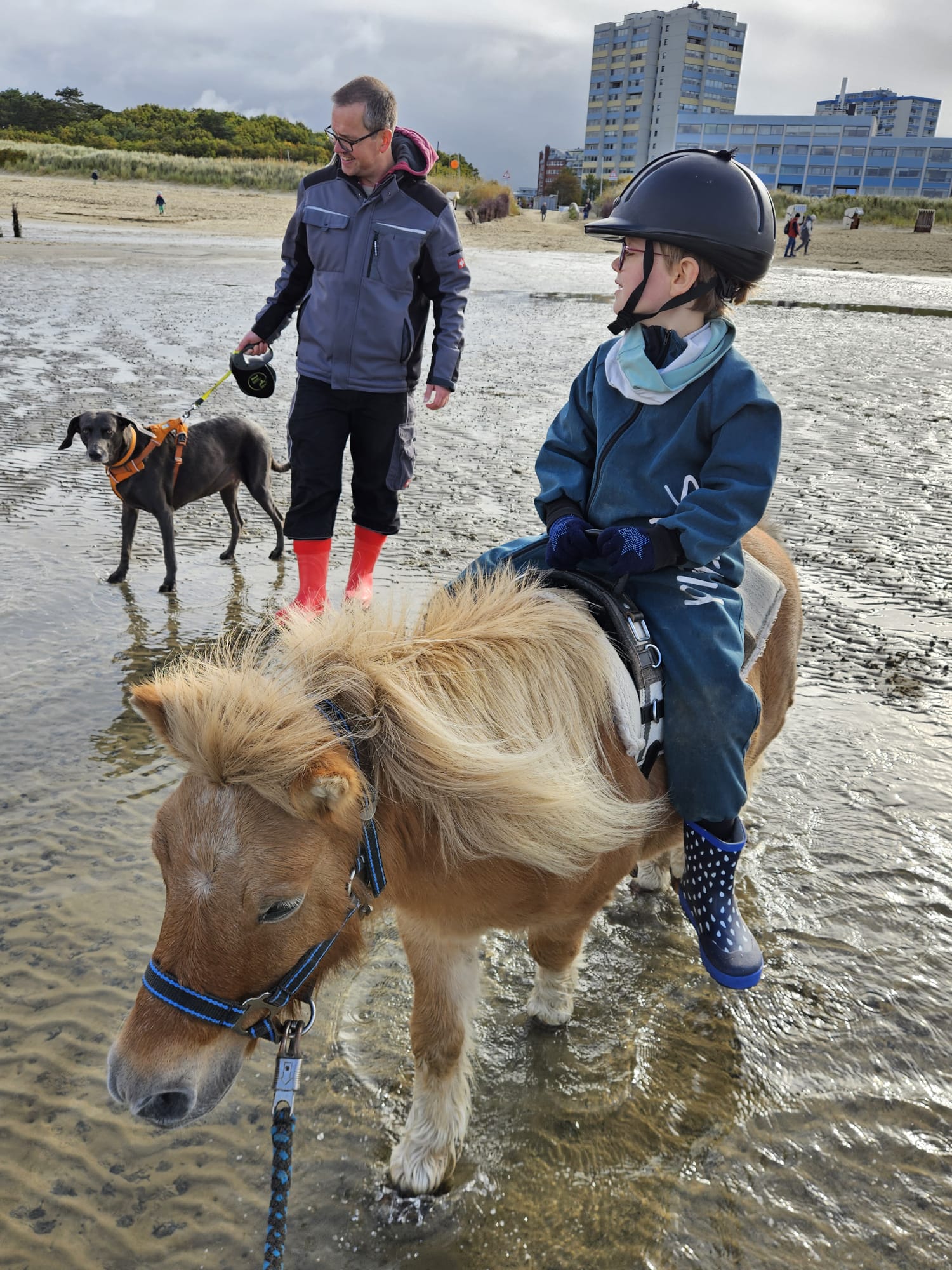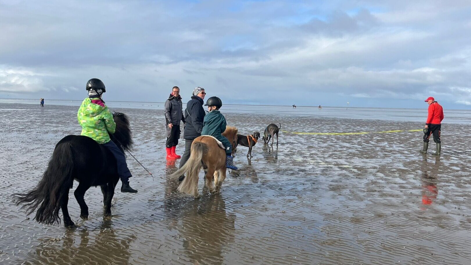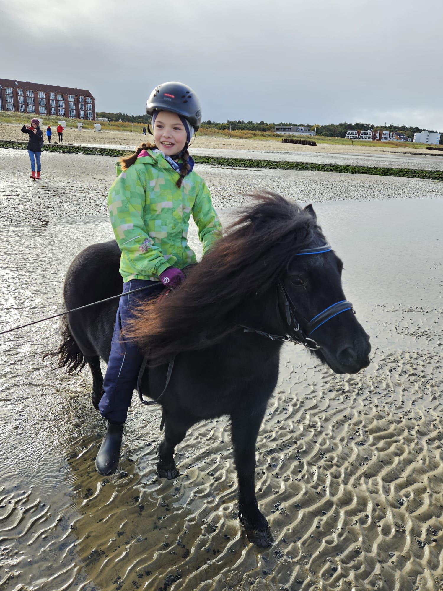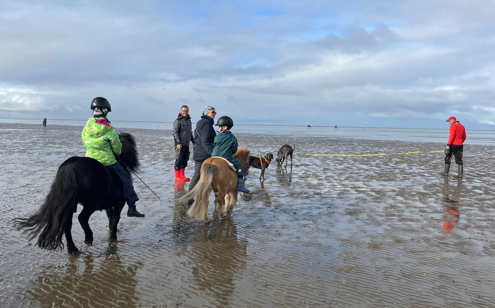 Dort angekommen wurden Dusty und Fine zu Reitponys für Klara und Jakob und los ging es Richtung Watt.